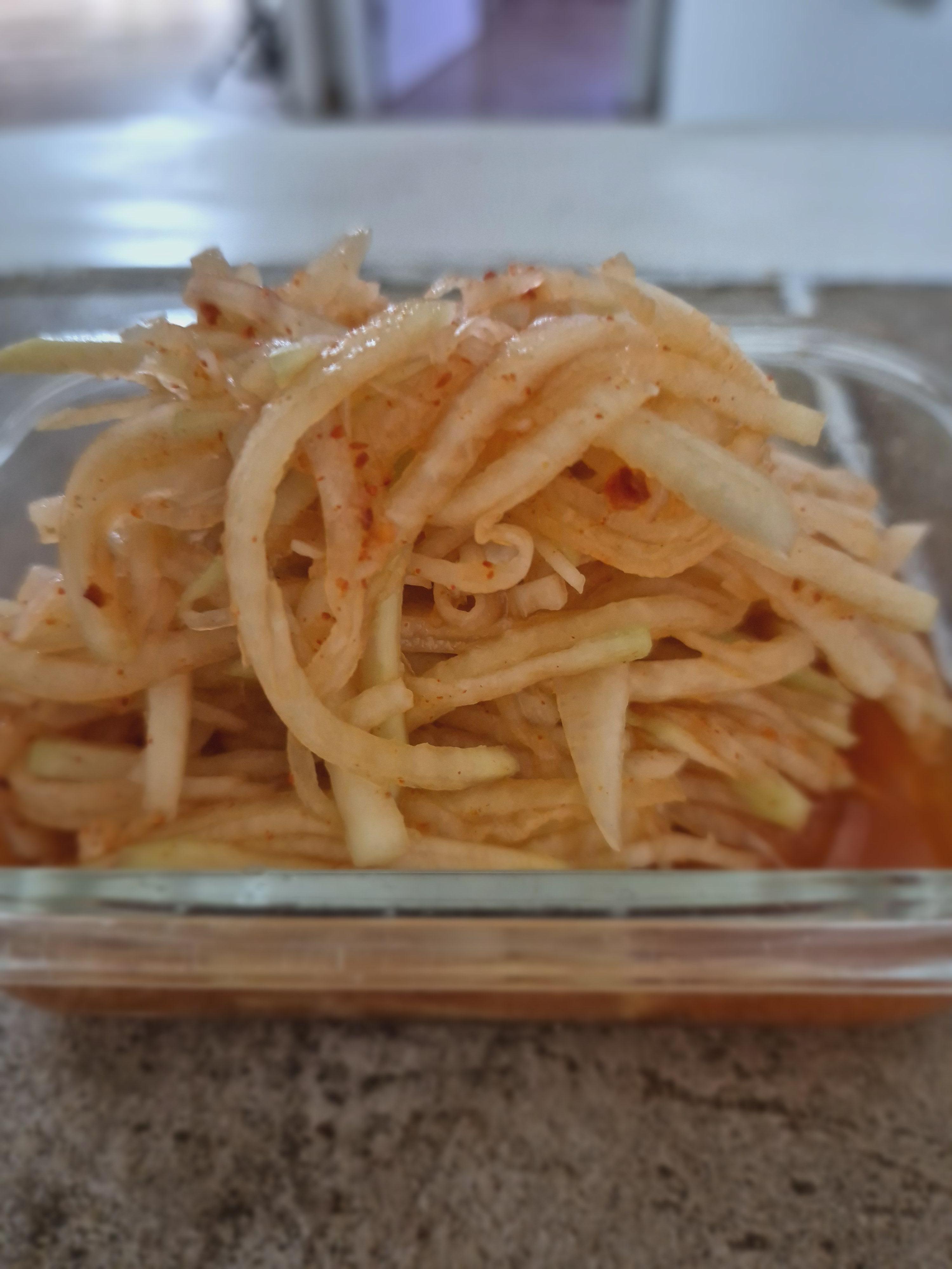 3. 채 썰어 놓은 무에 양념장을 부어 줍니다. 잠시 재워두고 간을 봐서 설탕이나, 식초를 추가 하셔도 됩니다.
